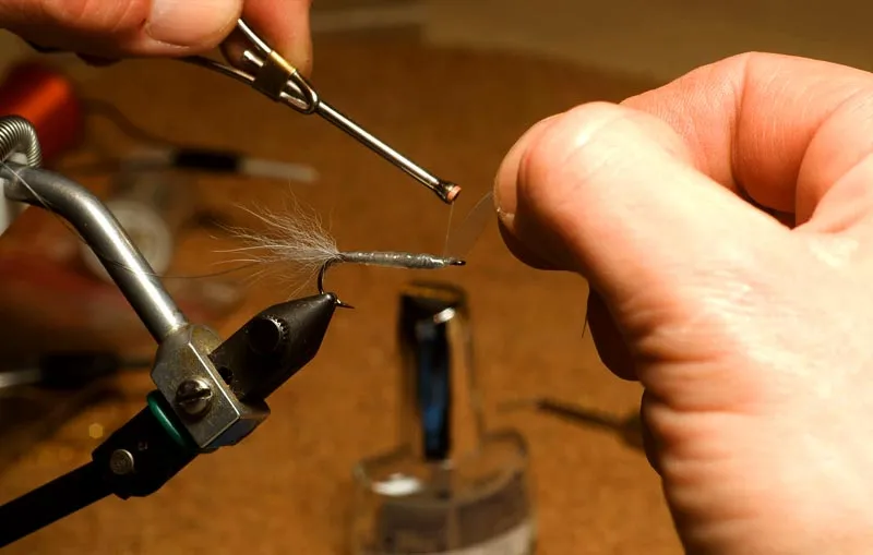 Tie off the plastic in the front of the hook. You don't need much space, so you can go close to the hook eye