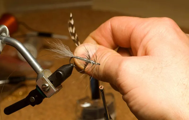 Wrap the hackle in 5-6 turns over the body, make sure not to twist is and have the barbs standing straight out from the body