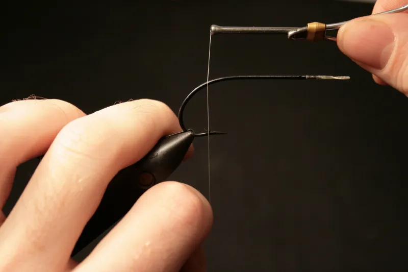 Start the thread a few turns in front of the barb point, do 3 turns and cut off the end.