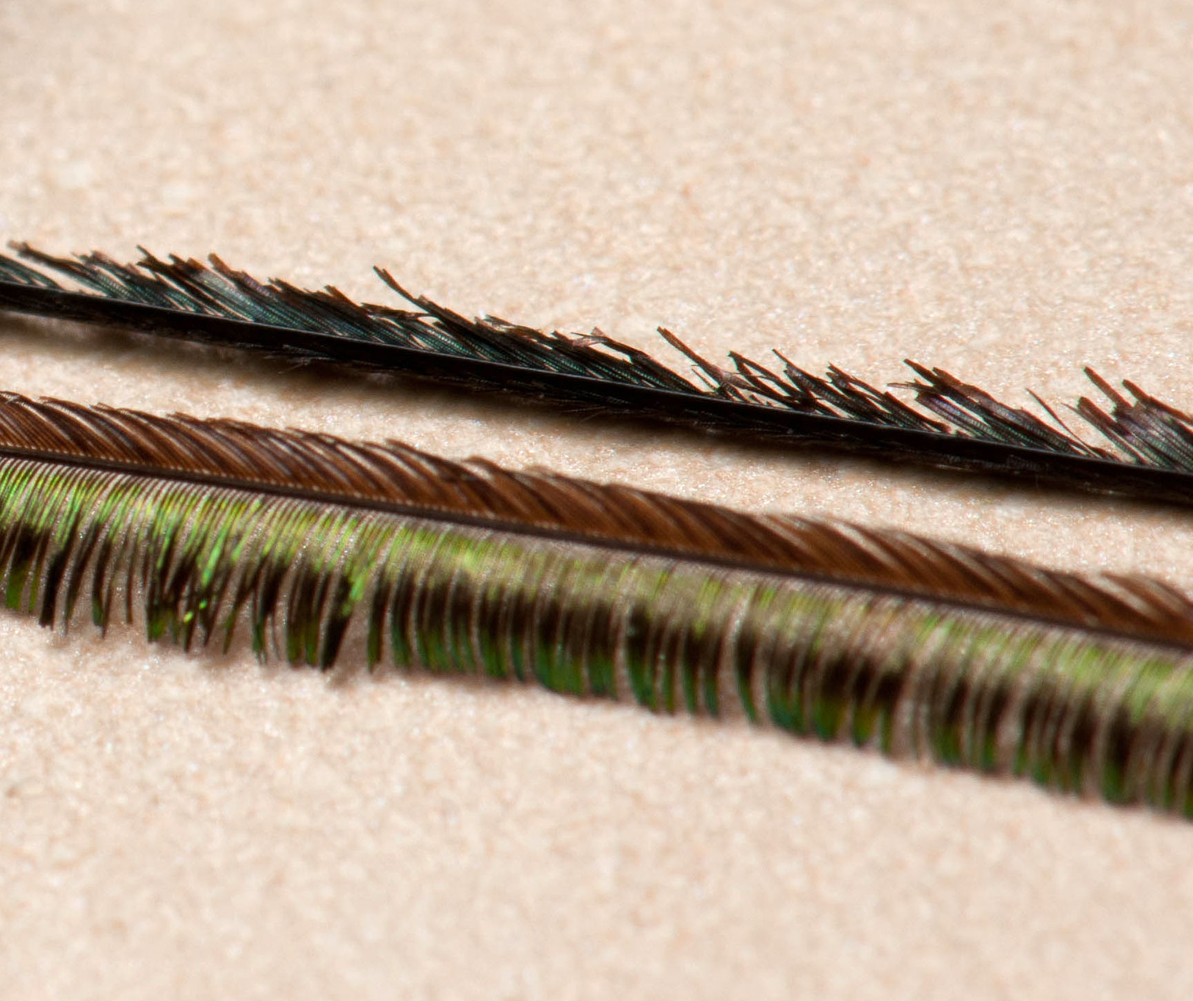 Any herl that is still kinked goes back into the bag for bodies and other less critical uses. You will usually use between two and six herl for the overwing. When you have what you need, just pinch them over the hook and tie them in. Mostly they will come out nicely.